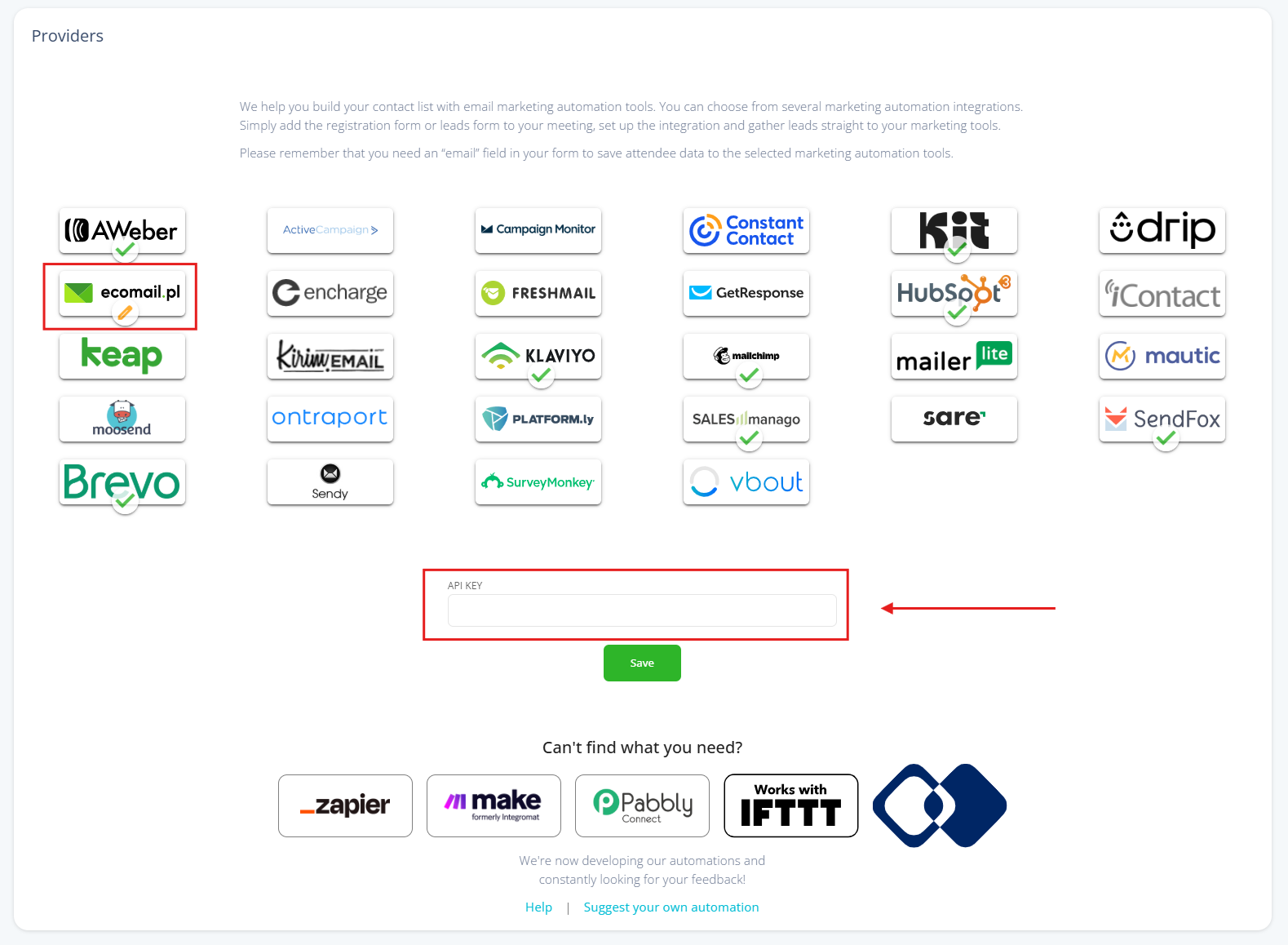1. Vyberte poskytovateľa: Prejdite do sekcie Integrácie > Marketing Automation a v zozname vyhľadajte logo Ecomail.