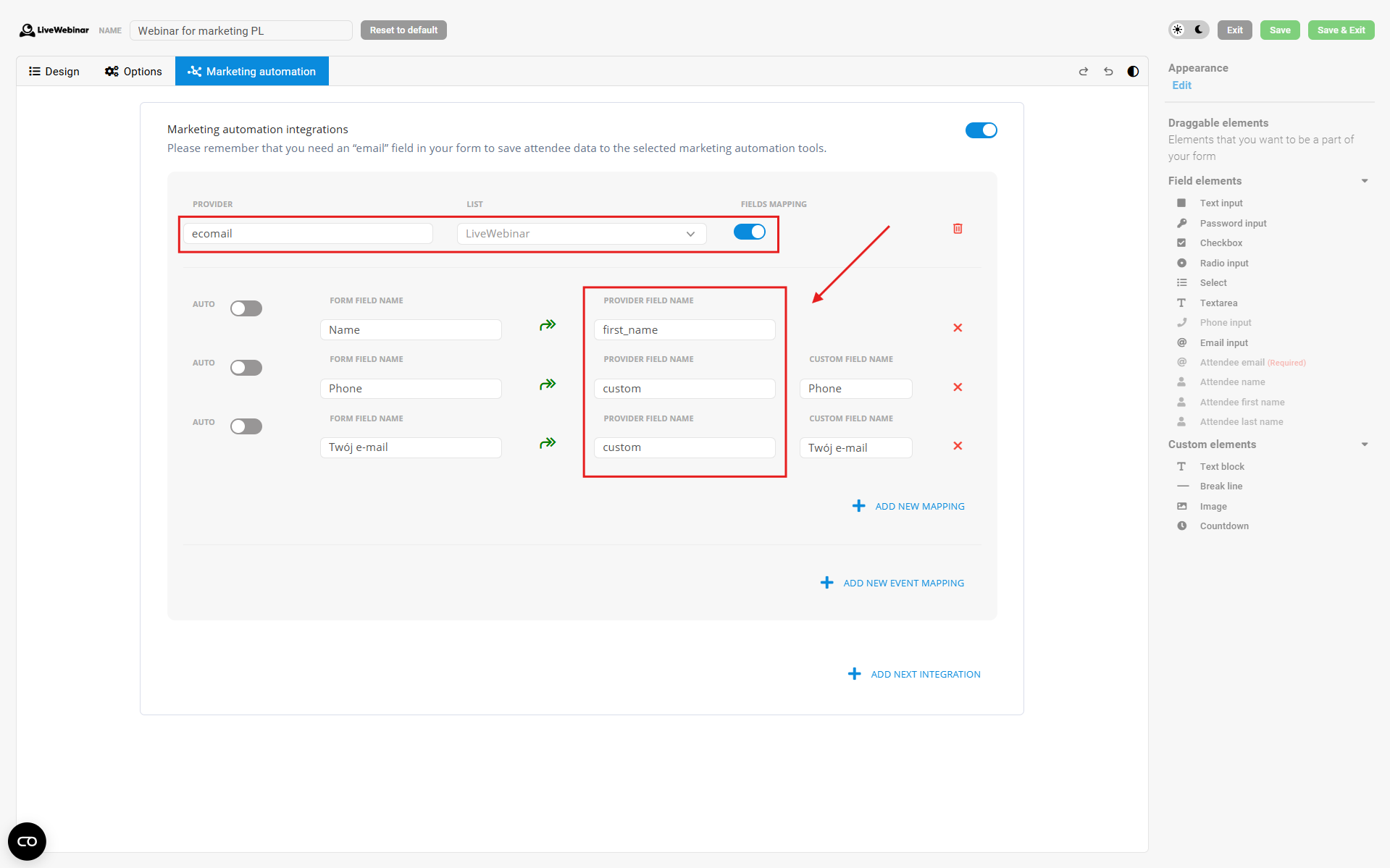 3. Uložte: Uložte zmeny a prejdite na vytváranie webinára.4. Nastavte formulár: Počas konfigurácie registračného formulára otvorte záložku Integrácie. Zo zoznamu poskytovateľov vyberte Ecomail, priraďte vybraný zoznam kontaktov a správne namapujte polia.