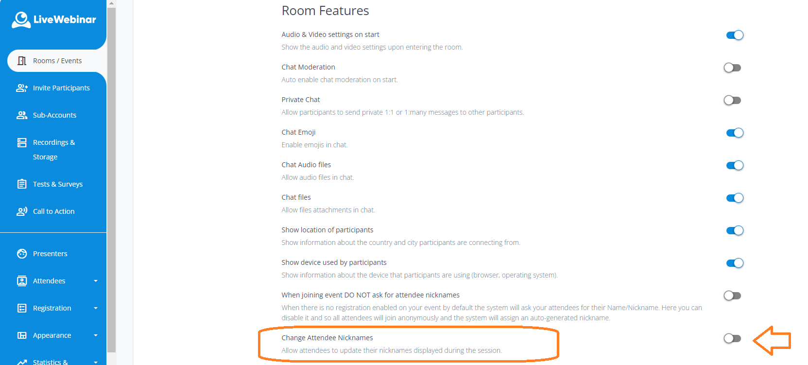 Yes, they can. You can allow them to update their nicknames displayed during the session. To enable this, go to the 'Advanced' tab in the event menu, find the 'Room Features' section below, and select the option shown on the screen.