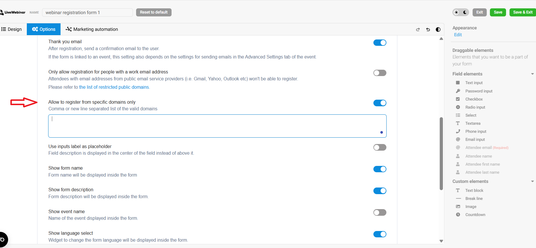 FAQ -> Forms -> Can I restrict webinar registrations to specific email domains?