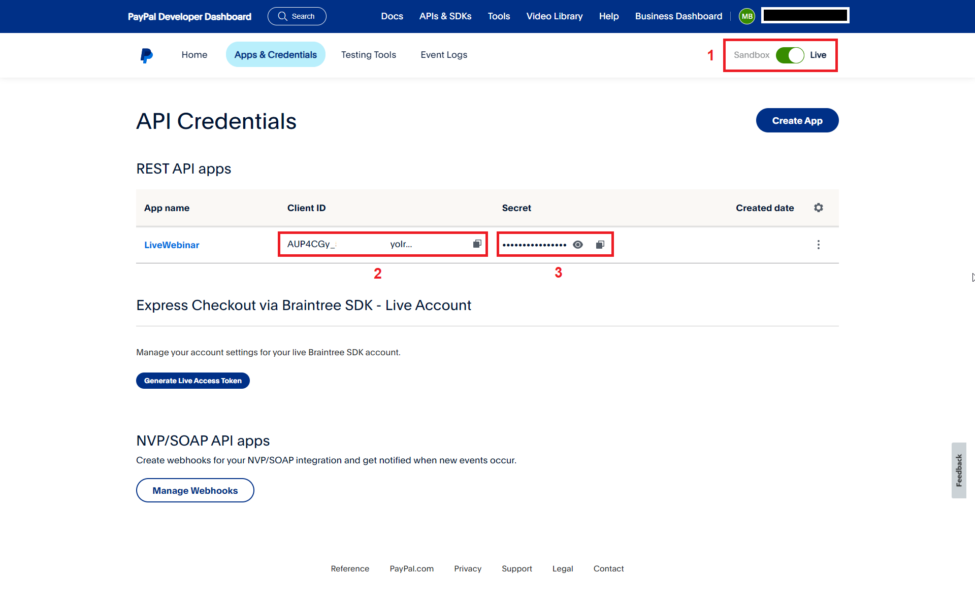 Make sure you are using the developer data in the live (production) version (1). Copy the Client ID (2) and Secret ID (3) and paste in the appropriate places on the LiveWebinar platform.