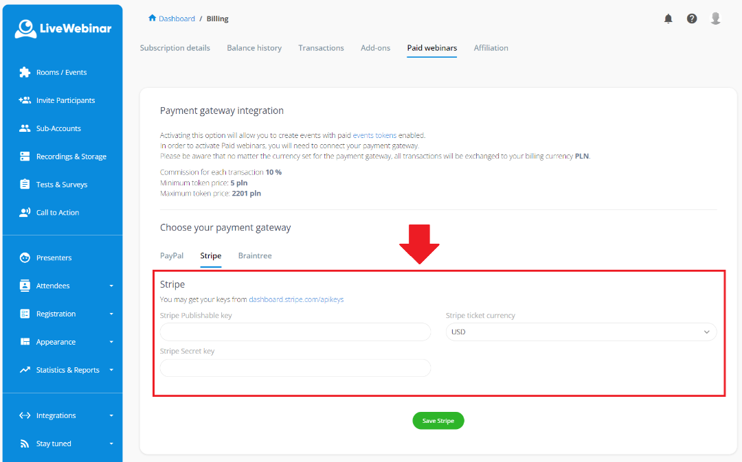 Możesz zmienić dostawcę, przechodząc do menu swojego profilu, klikając „Rozliczenia”, a następnie otwierając zakładkę „Płatne webinary”. Zobaczysz wybraną bramkę płatności i będziesz mógł ją usunąć oraz połączyć z inną.