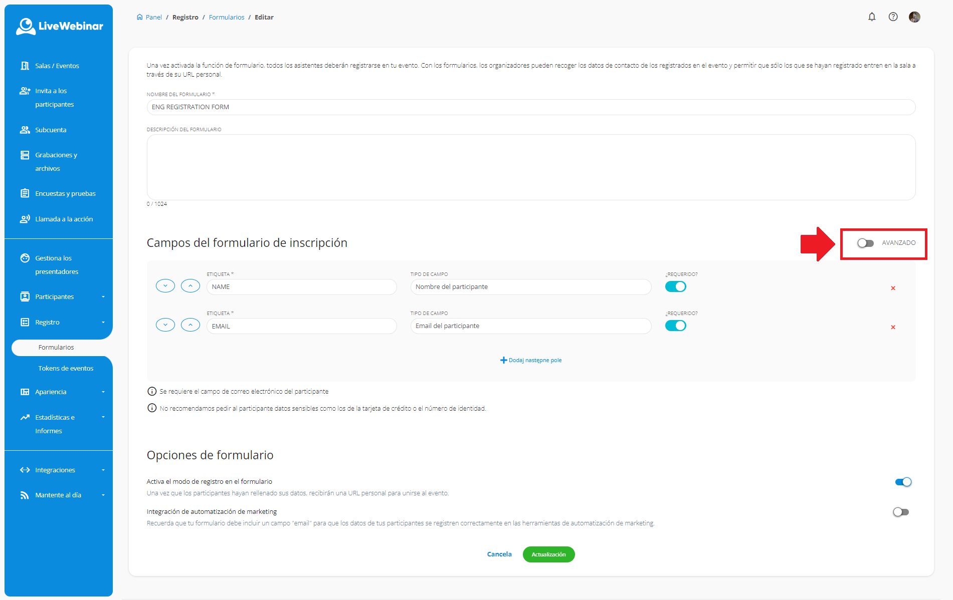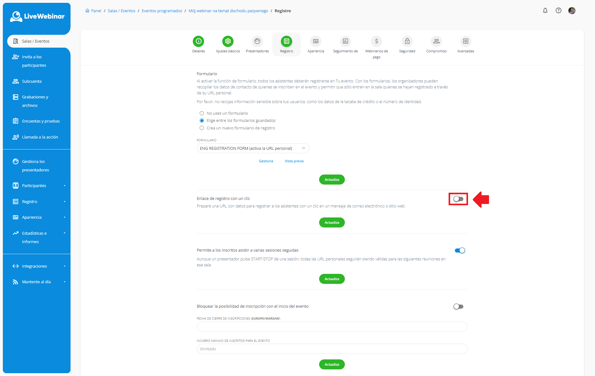 Lo encontrará en el panel de creación de eventos, en "Registro".