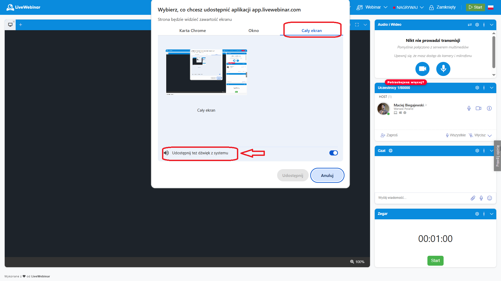Możesz udostępniać dźwięk razem z wideo w pokoju webinarowym. Aby to zrobić, postępuj zgodnie z krokami pokazanymi na ekranie poniżej. Pamiętaj, że dźwięk możesz udostępniać w dwóch przypadkach: podczas udostępniania karty Chrome lub całego ekranu.