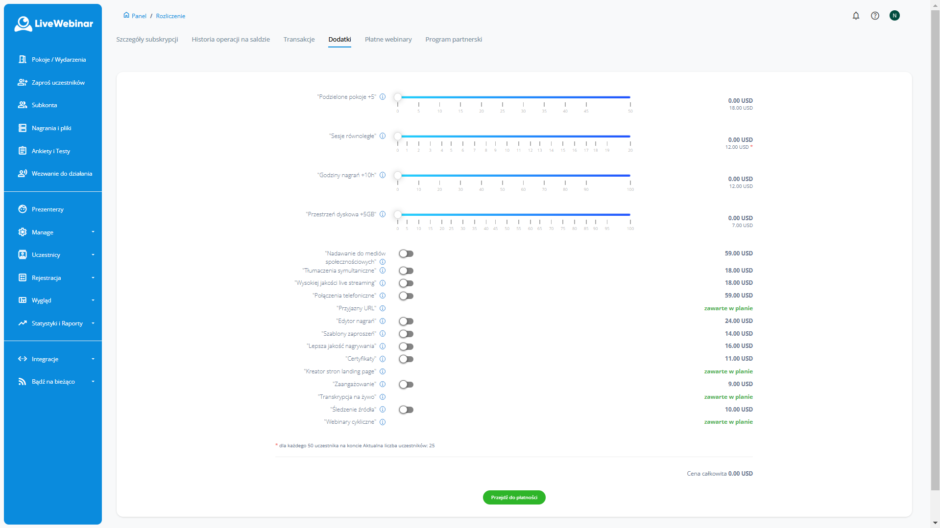 Po wprowadzeniu szczegółów płatności przejdź do karty dodatków i wybierz dodatek, który chcesz kupić. Zakup dodatków, takich jak sesje równoległe, dodatkowe godziny nagrywania lub dodatkowa przestrzeń dyskowa, odbywa się poprzez wybranie określonego pakietu na suwaku. Inne dodatki, takie jak transmisja do mediów społecznościowych, tłumacze językowi, transmisja na żywo HQ, mostek telefoniczny, przyjazne adresy URL lub edytor nagrań, można kupić, wybierając daną funkcję.