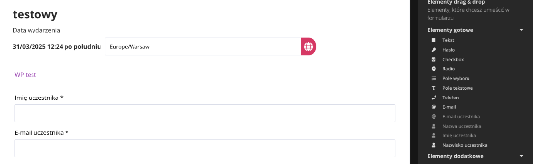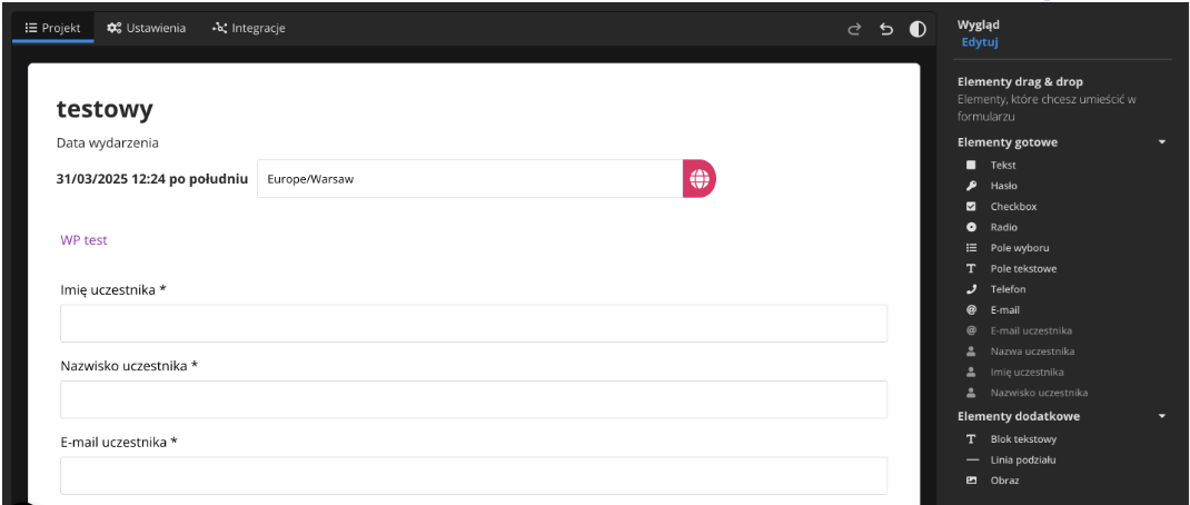 - Imię (używając elementu Imię uczestnika z bocznego paska elementów)