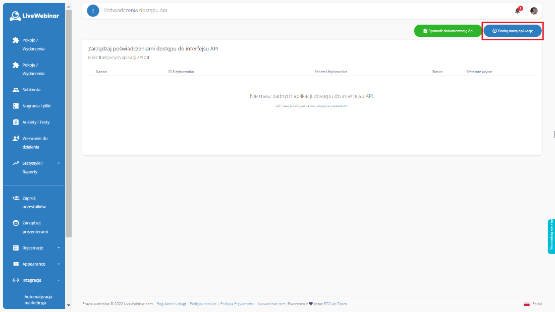 1. Aby je uzyskać wejdź do zakładki Integracje w menu głównym swojego panelu użytkownika LiveWebinar i kliknij na opcję Dane Dostępowe API.