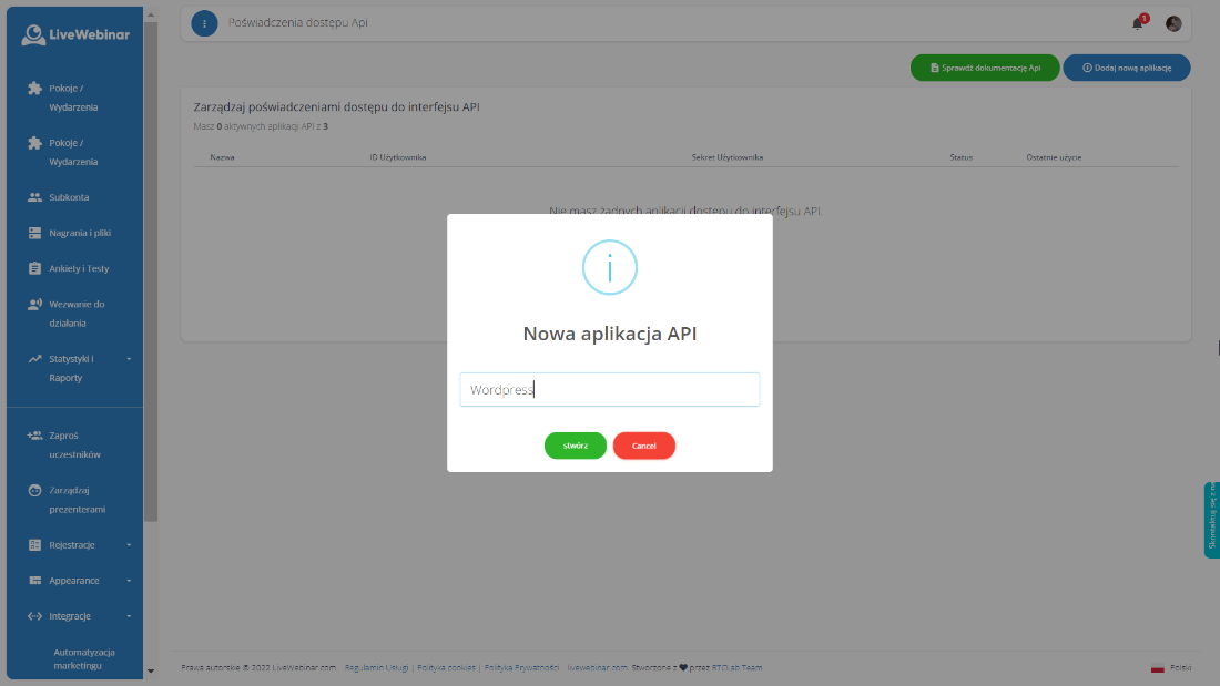 Niektóre integracje wymagają od Ciebie podania danych uwierzytelniających do konta LiveWebinar (np.. Wordpress). Wśród nich mogą być wymagane także dwa nietypowe pola umożliwiające poświadczenie dostępu do interfejsu API – ID użytkownika oraz sekret użytkownika.