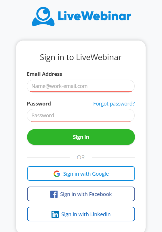 1. An account assistant logs in with the email/login you provide, and the password you set for them. This information is entered directly in the LiveWebinar login dialogue box.