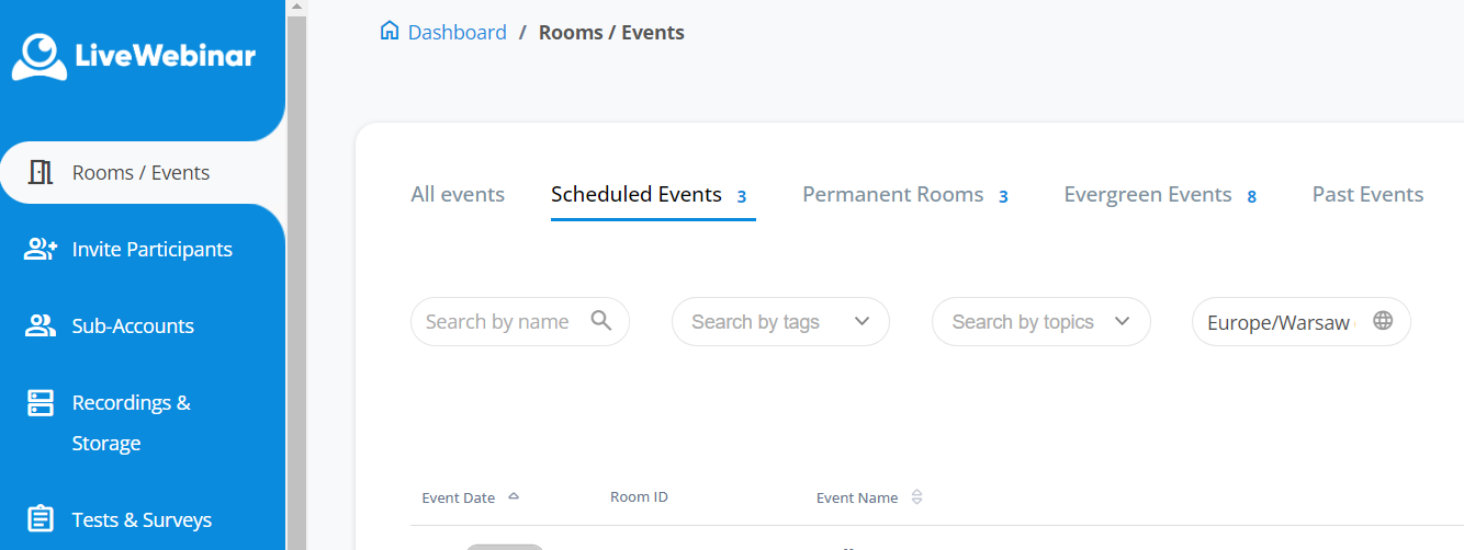 2. Once in the main account, the assistant can access everything except for the main account’s profile, billing information and cannot manage other assistants. They can create new events, access the storage, upload new materials to it, assign/create presenters and more.