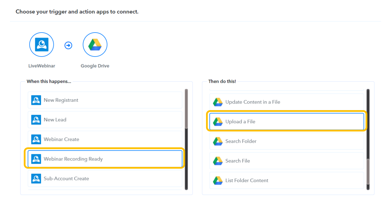 1. Repeat the first step from here. To create a new "workflow", select LiveWebinar with the trigger "Webinar recording ready" as the Trigger App and the so-called Action App select Google Drive with the "Upload a File" Event (it can also be Dropbox or a similar platform, eg Microsoft OneDrive).
