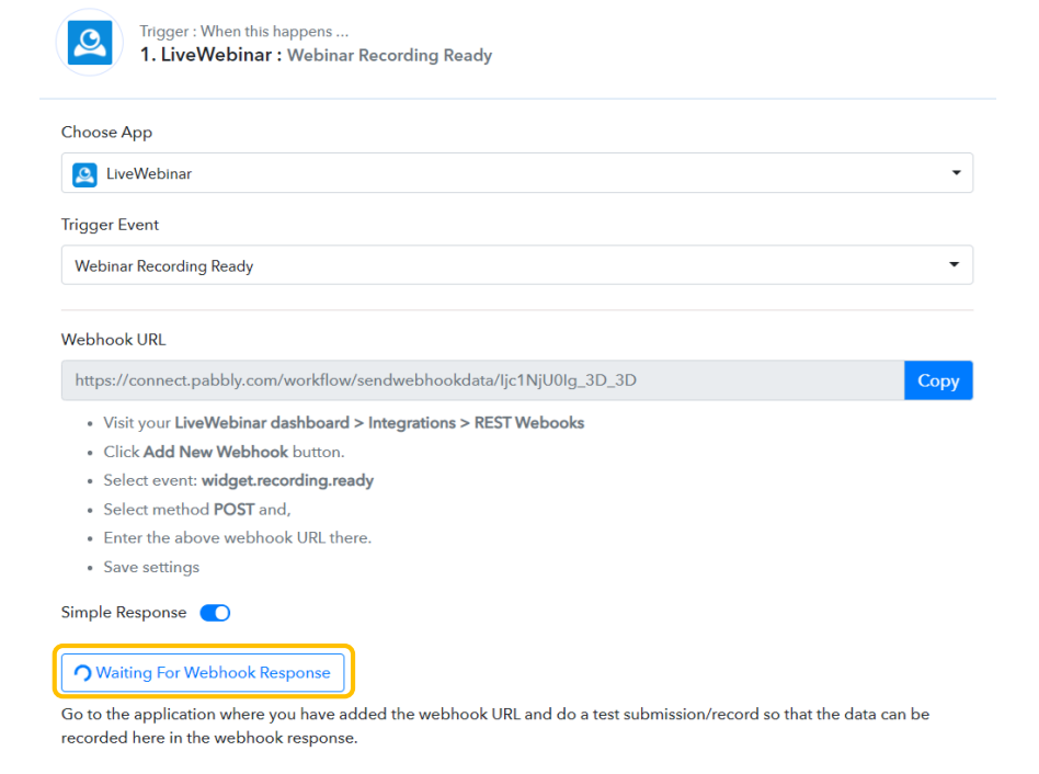 Copy the generated Webhook URL. At this point, Pabbly Connect will be waiting for a response from LiveWebinar, as evidenced by the animated icon and the "Waiting for the Webhook Response" status. We now need to go to the Webhook panel in LiveWebinar and add a new webhook that will send the relevant data to Pabbly Connect.