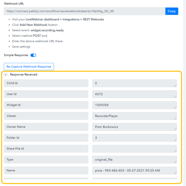 FAQ -> Pabbly Connect -> How to add Webhooks containing information about new recordings