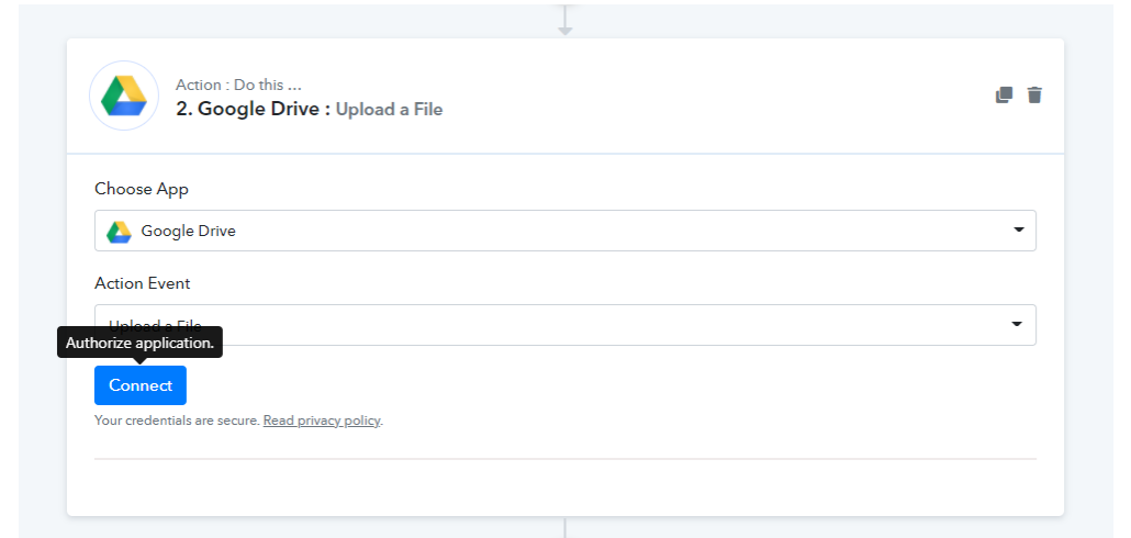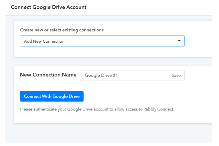 Then we must allow PabblyConnect to access our Google Drive, to do this, click "Connect with Google Drive", log in and click the "Allow" button.