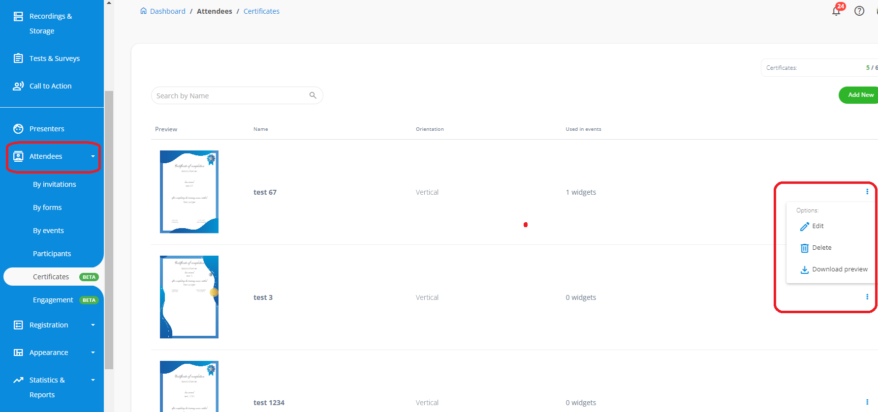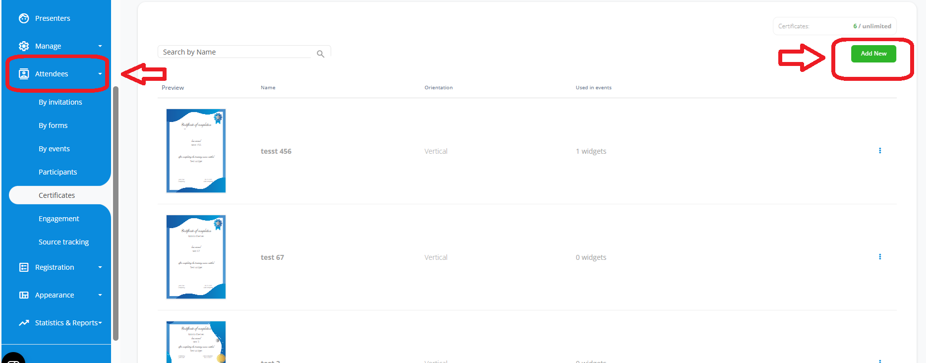 To find your saved Certificates, go to the left sidebar and choose “Attendees” tab. Then select “Certificates”. Once you do that, the list of your saved certificates will open.