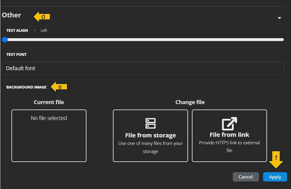 - Add a background image. Either download it from storage in the tool or provide a link from an external source (URL).