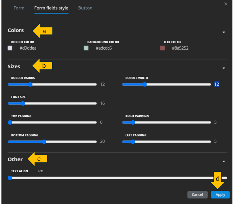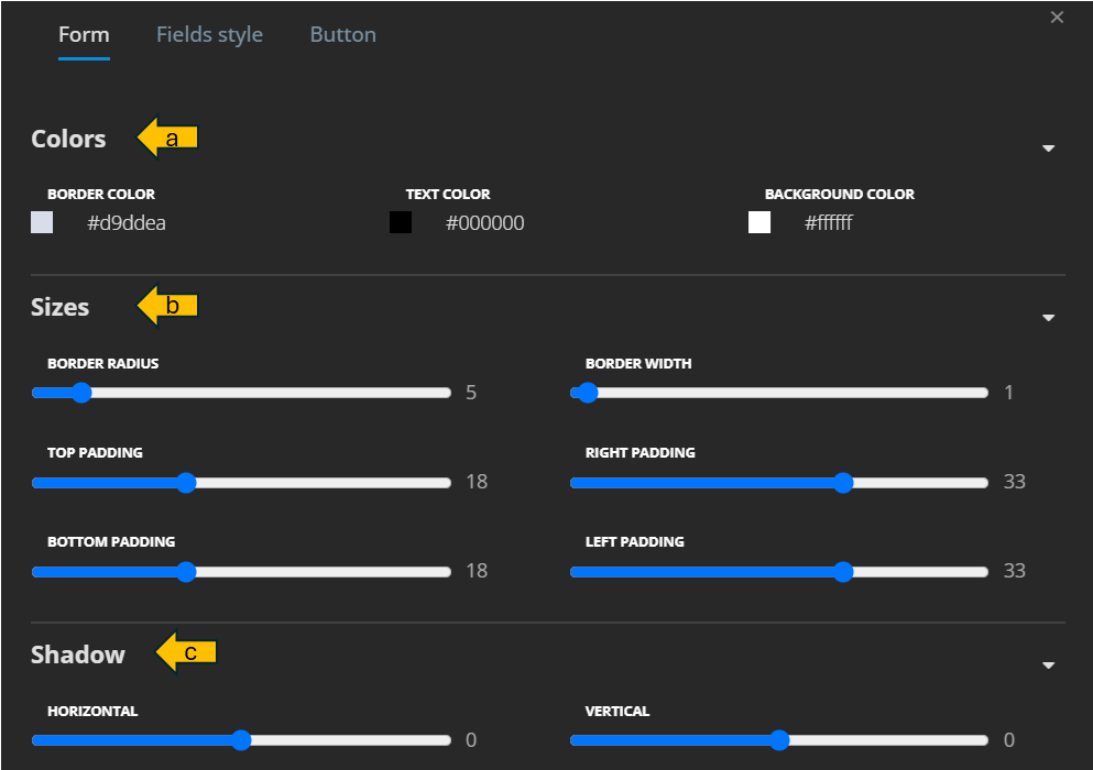 - Sizes: Adjust border radius, border width, left padding, right padding, top padding, bottom padding.