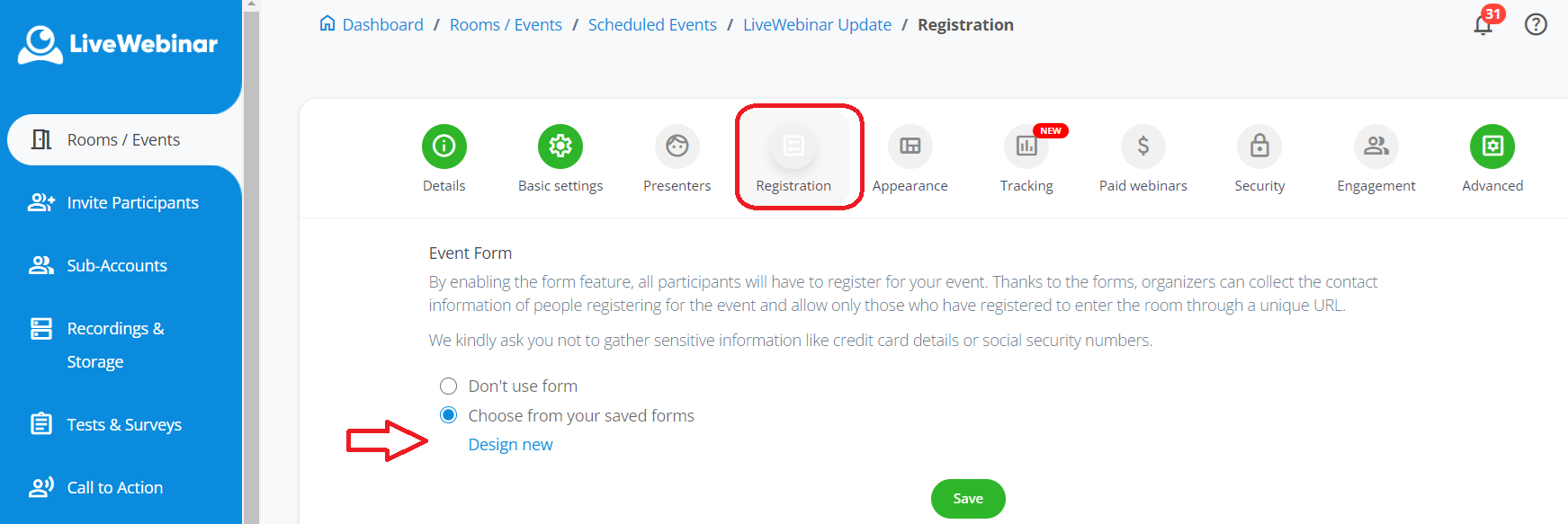 - Go to the ‘Registration’ tab in the left-side panel of the dashboard and choose ‘Forms’.