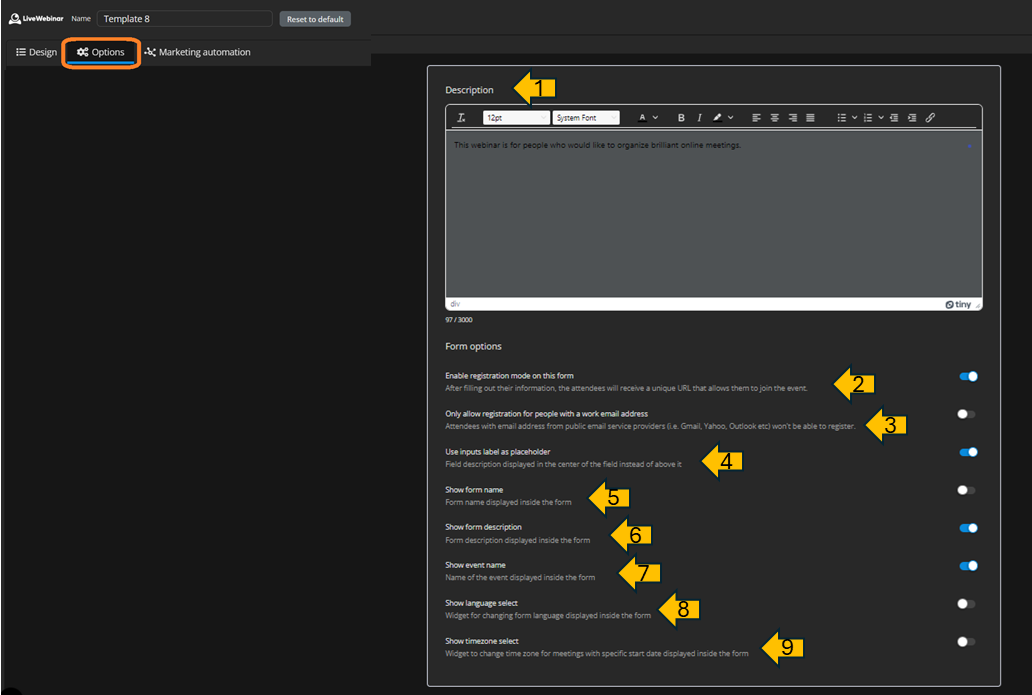 - The upper navigation bar – You’ll find options to choose from: Design, Options, and Marketing automation. We will describe them in detail later on in this manual.