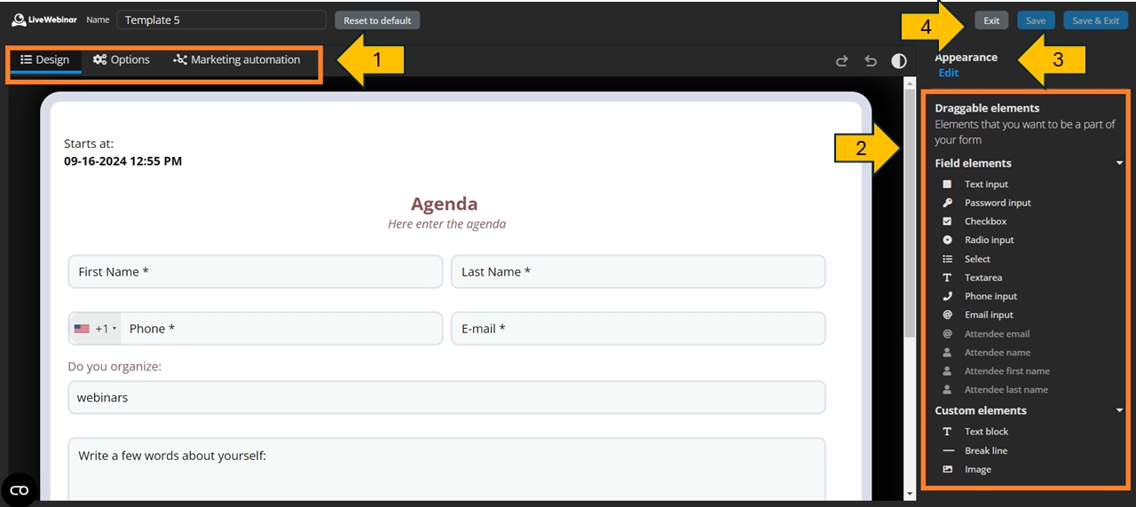 - Draggable elements – In the right sidebar, you’ll find a list of draggable elements. While creating your form, you’ll just need to pull and drag them into the editor window. It is advisable to first add all the desired elements to your form and only then proceed to the Appearance tab, where you can design the appearance of your form, giving it the colors of your choice and editing other visual elements.