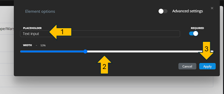 - Width – You can decide how wide the element will be. For example, if you want it to occupy half of the space in the line, set the option to 50%.