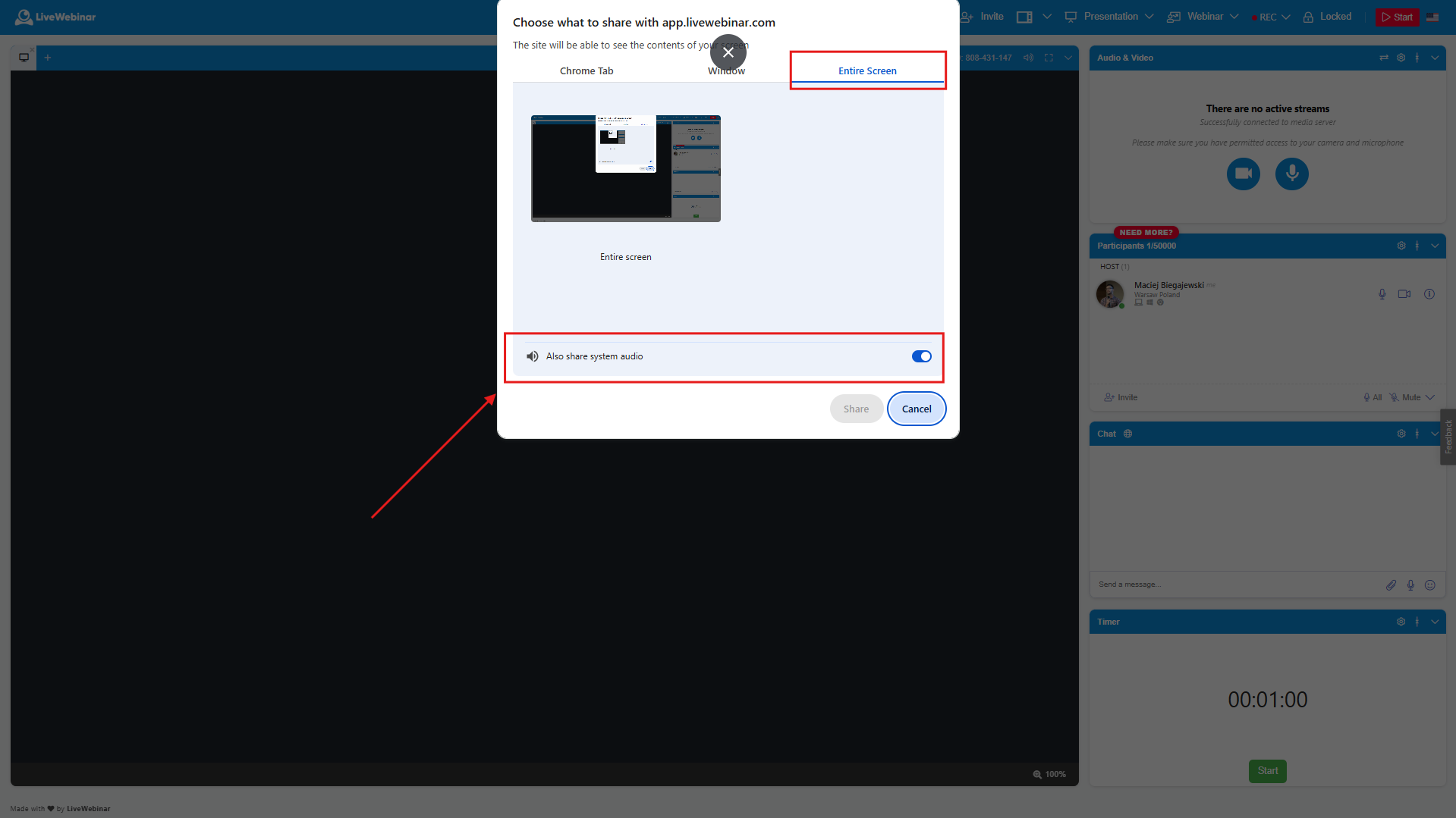 You can share the audio along with the video in the webinar room. To do so, you need to follow the steps shown on the screen beneath. Remember that you can share the audio in two cases: when sharing the Chrome tab or the Entire Screen.