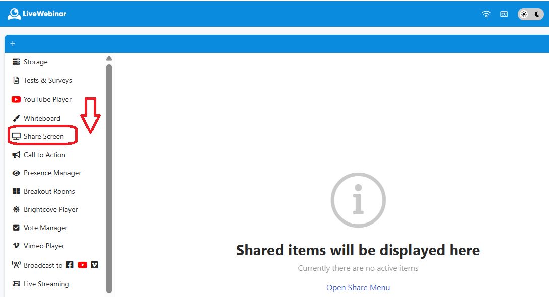 You can find this option in the menu signed with “+” in the upper left corner of the webinar room.