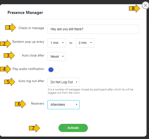 3. Auto close after - define the duration of the pop up on the attendee screen.