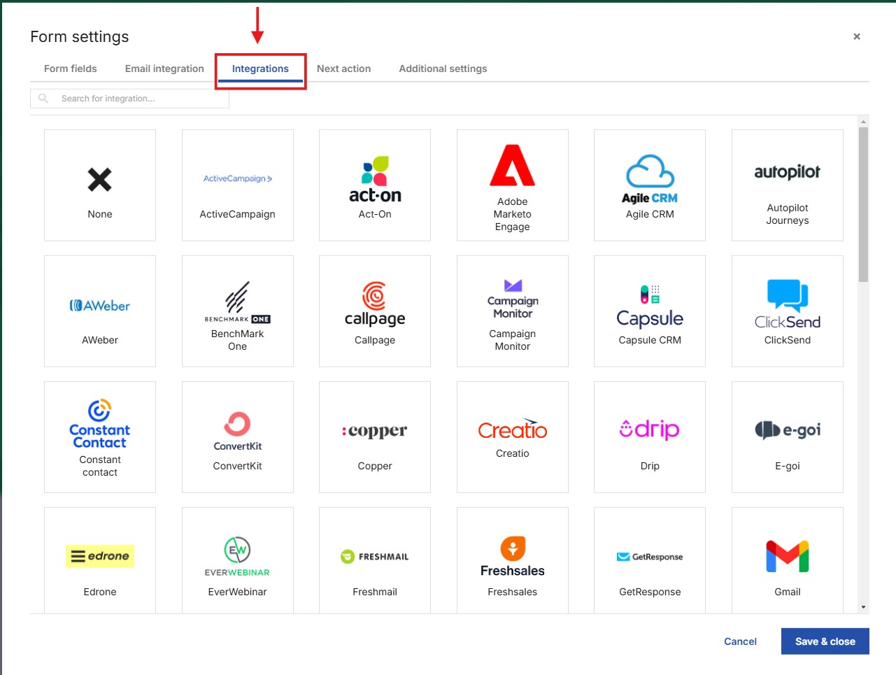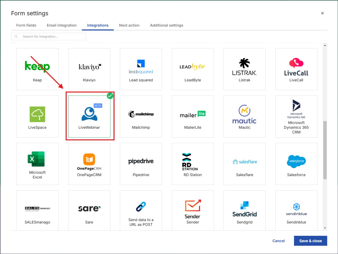 5. Next, go to the Integrations tab and select the LiveWebinar logo from the list of available applications