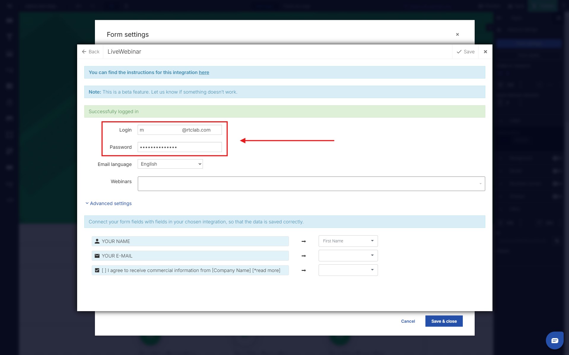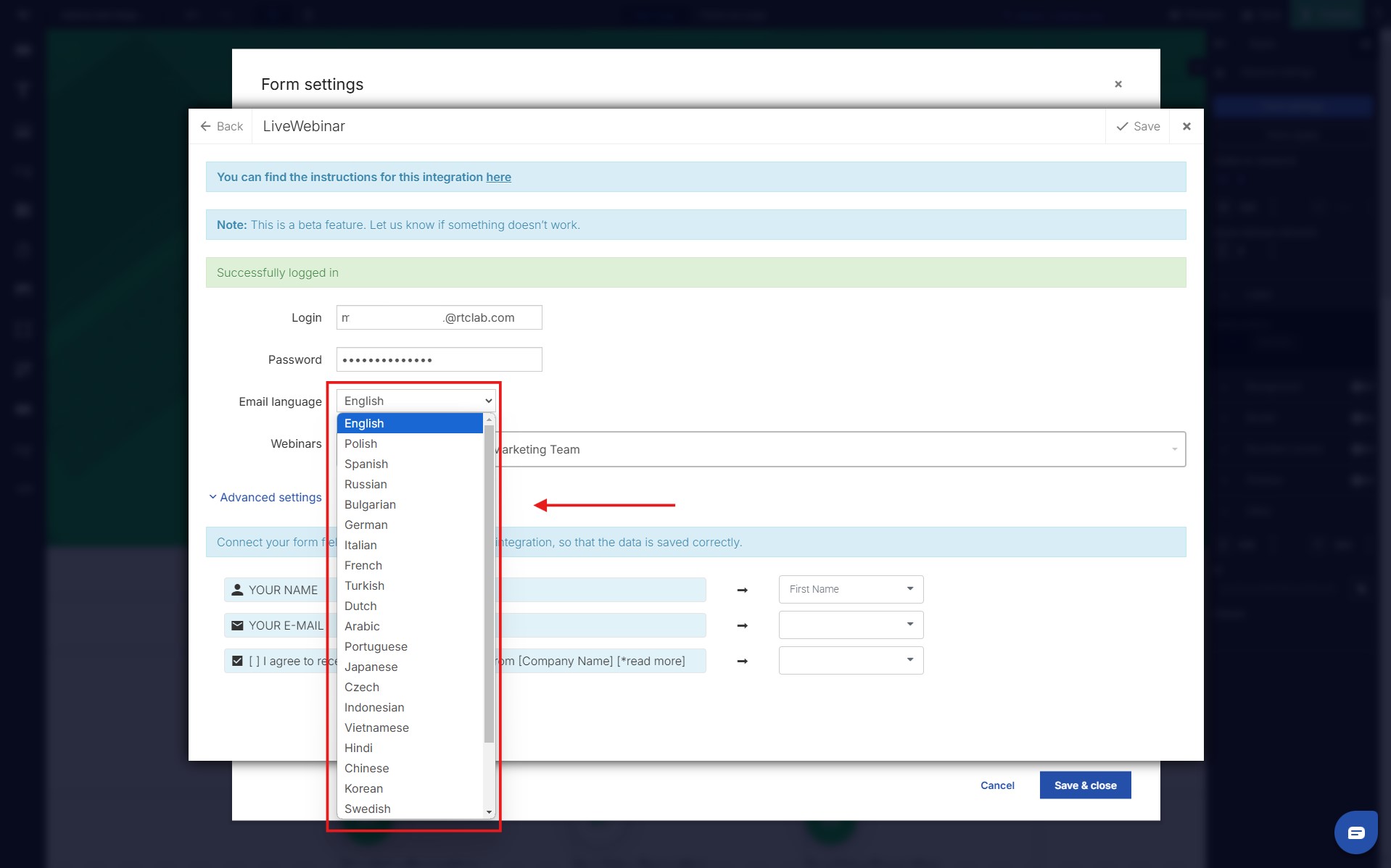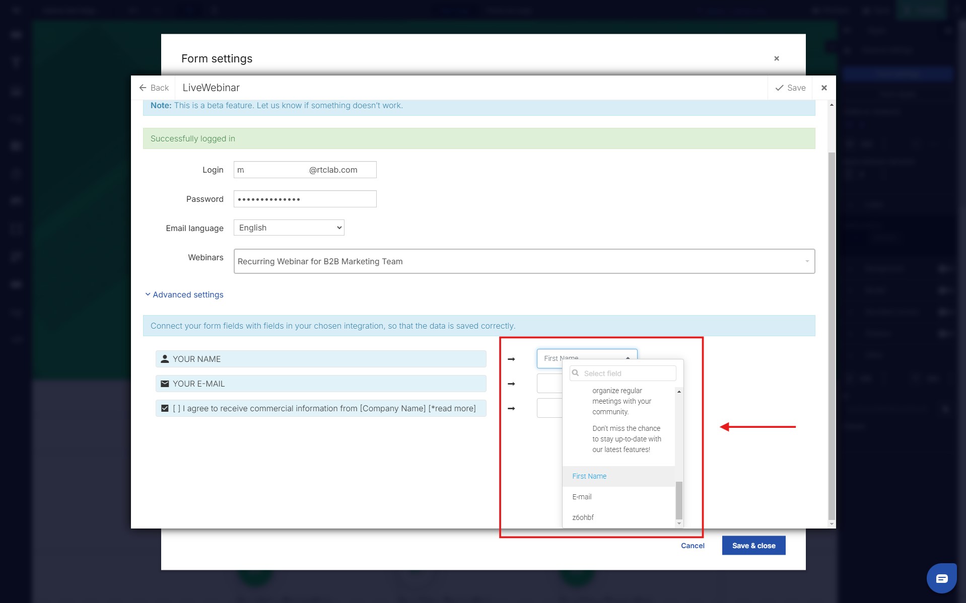 9. Remember to properly match the fields from the form available in the Landingi wizard and the one assigned to the event on the LiveWebinar platform.