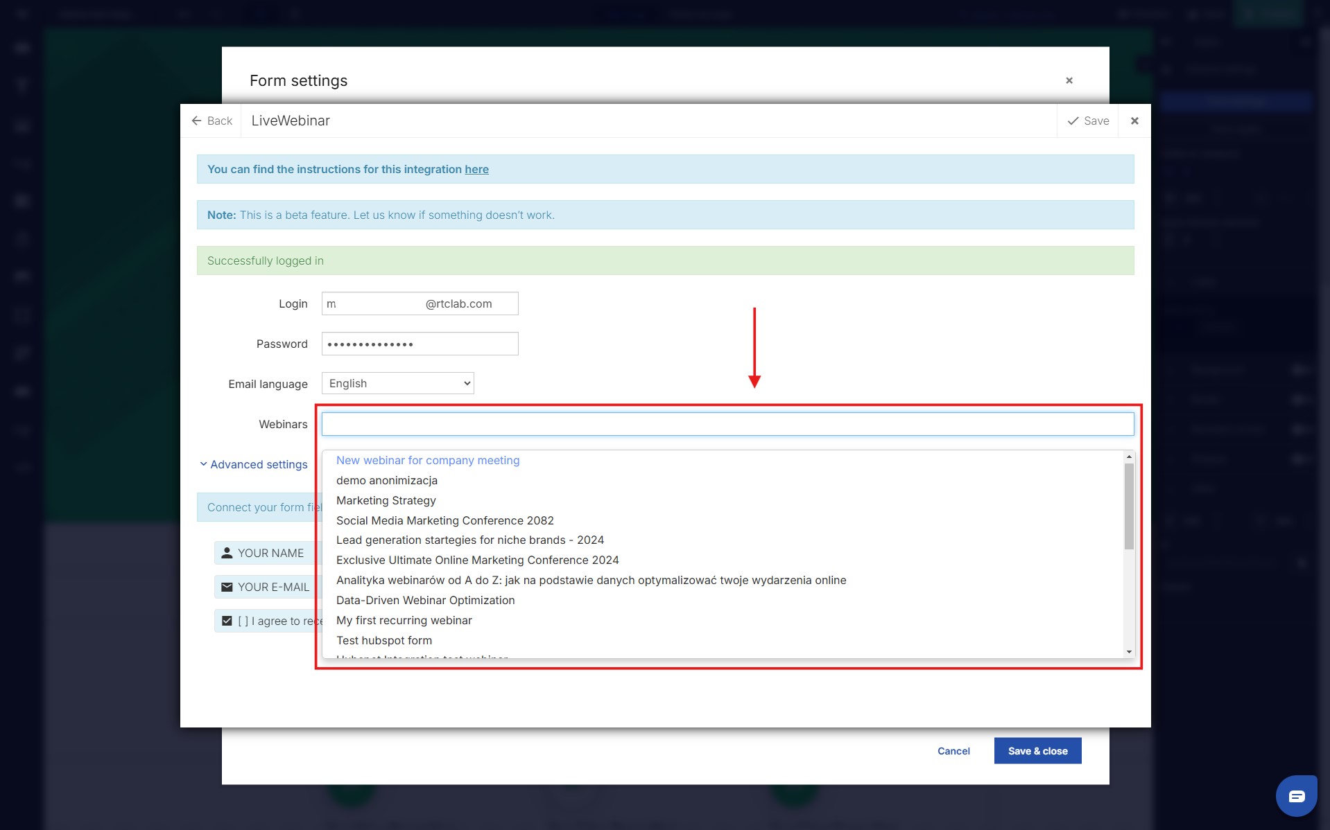 8. Now you can select from the list of webinars the one you want the records to go to from the form embedded in the landing page.
