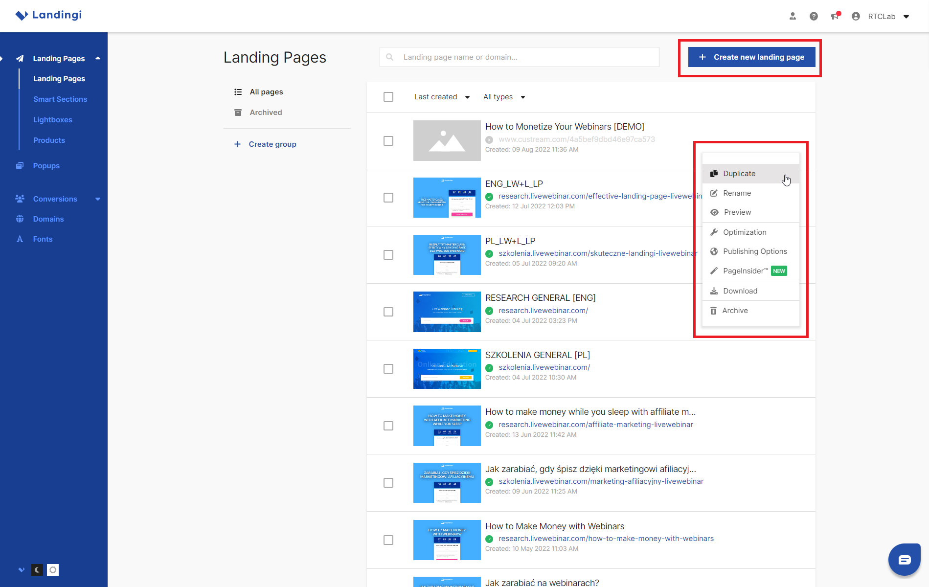 2. Once your event is ready, you can proceed to build your landing page using the wizard on the landingi.com platform. To do so, log in to landingi.com and from your user panel, select CREATE A NEW LANDING. If you already have an existing landing page on this site you can also use the duplicate function.