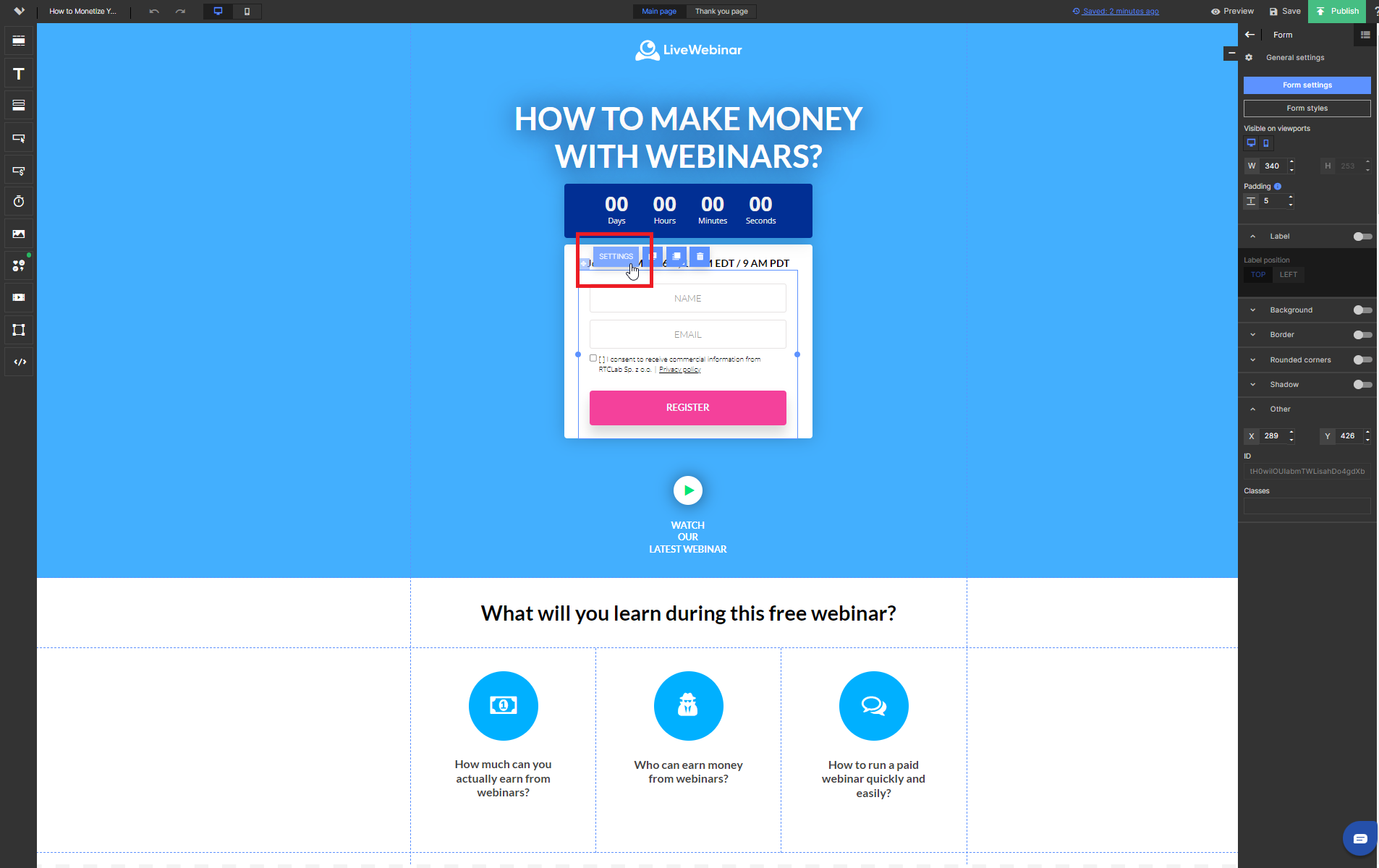 4. After adding a sign-up form to your project, click and open its settings.