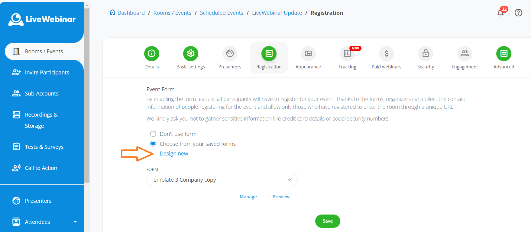 1. First, create a webinar room on the LiveWebinar platfom and assign a corresponding signup form to it. The signup form should have the same fields as the form that will be displayed on the landing page.