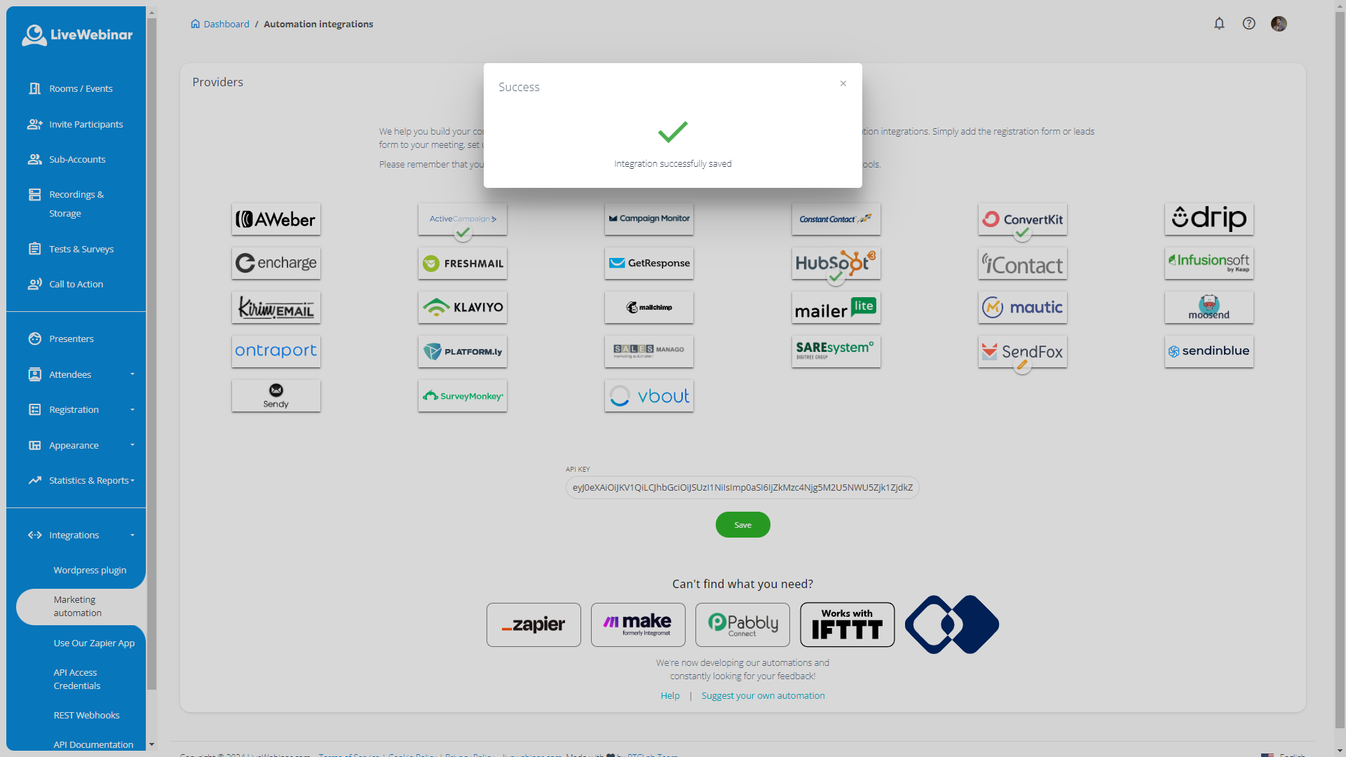 Copy the API key and paste it into LiveWebinar. Next, click on “Save” button.