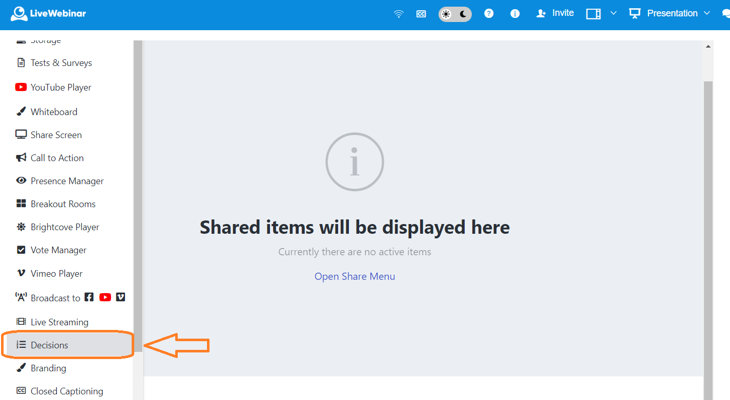 The 'Decision' function enables you to ask your attendees questions during the webinar or meeting. Thanks to it you can show the results of the poll immediately to your audience.