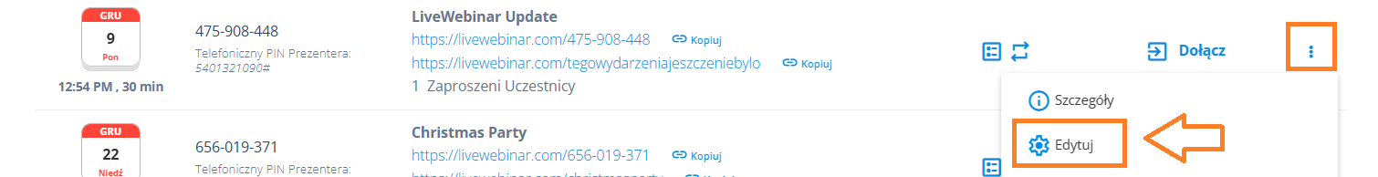 2. Kliknij na ikonkę z opcjami przy wybranym wydarzeniu, a następnie wybierz opcję „Edytuj”.