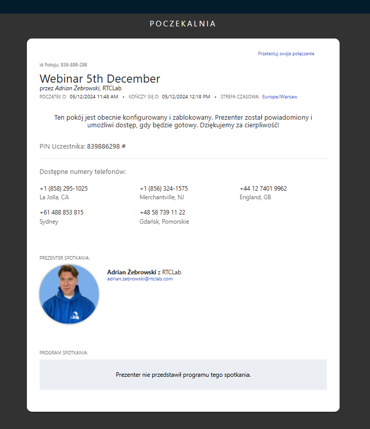 - Prezenter spotkania – tutaj zostanie wyświetlony prezenter wydarzenia wraz z krótką biografią lub danymi kontaktowymi (jeśli informacje zostały dodane przez prezentera).