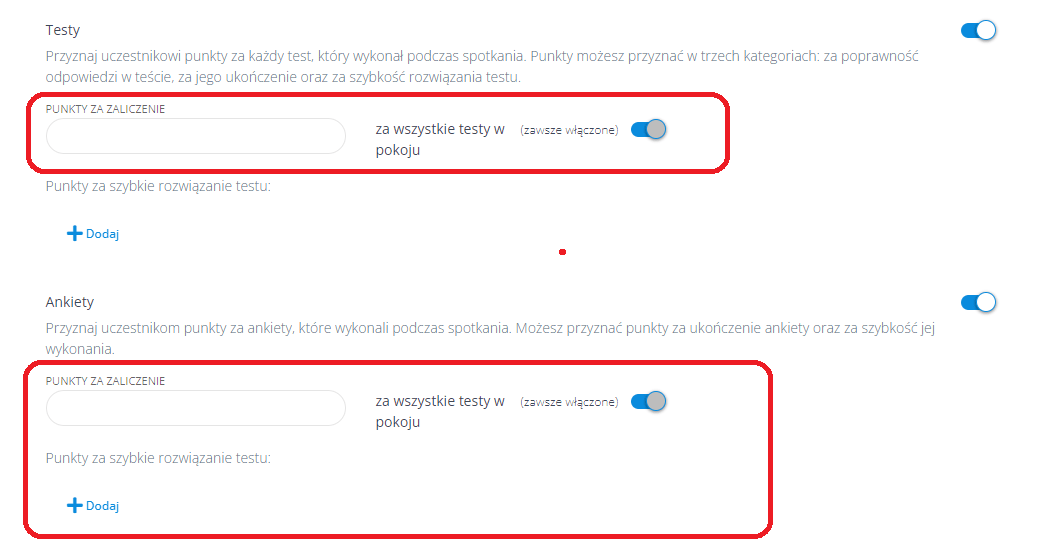 Możesz również przyznawać uczestnikom punkty za każdy wykonany przez nich test. Możesz ustawić takie kryteria, jak: czas ukończenia w minutach lub poprawność testu.