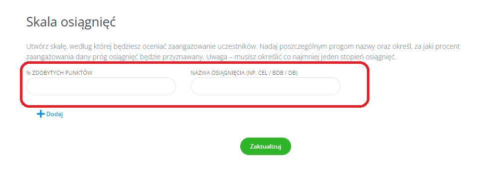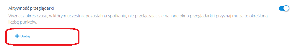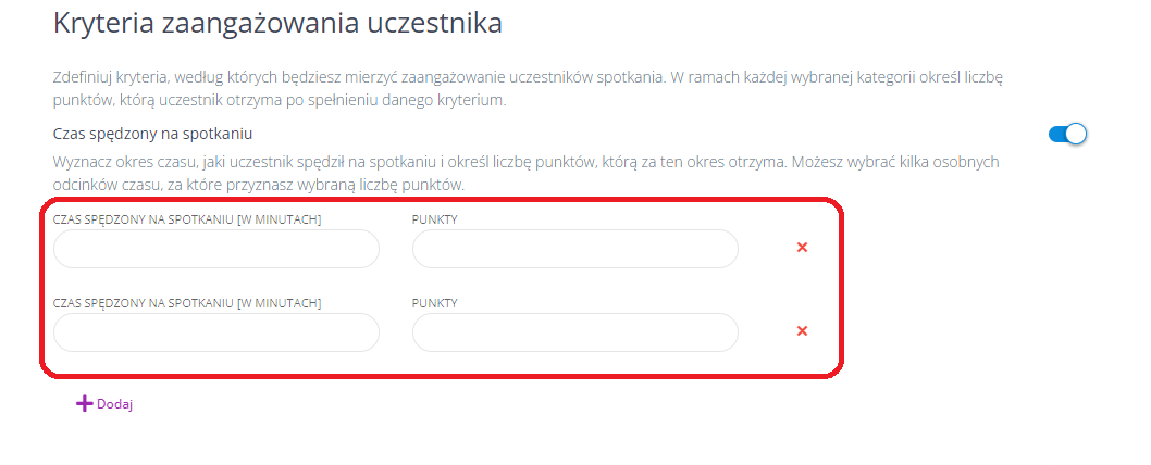 Tutaj możesz określić kryteria, według których będziesz mierzyć zaangażowanie uczestników spotkania. Dla każdej wybranej kategorii określ liczbę punktów, jaką uczestnik otrzyma po spełnieniu danego kryterium.