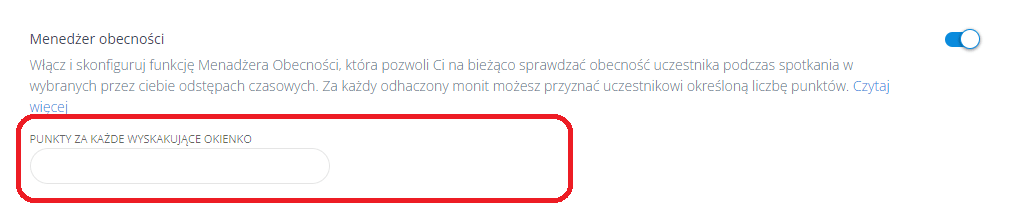 Możesz również ustawić specjalną funkcję Menedżera Obecności. Jeśli ją włączysz, pozwoli ci ona sprawdzać obecność uczestników w trakcie spotkania w wybranych przez ciebie odstępach czasu. Za każde odhaczenie przez niego pop-upu możesz przyznać uczestnikowi określoną liczbę punktów.