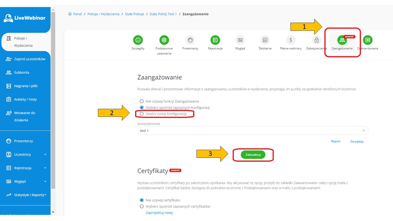 Należy zauważyć, że funkcja Zaangażowania jest ściśle powiązana z funkcją Certyfikatów. Aby przeczytać więcej o Certyfikatach, przejdź tutaj.
