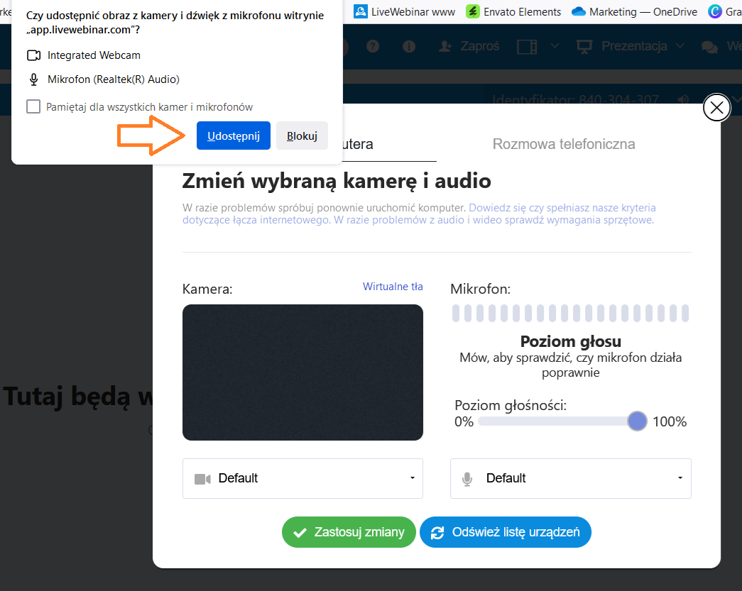- Po włączeniu kamery powtórz tę samą procedurę dla ustawień mikrofonu.