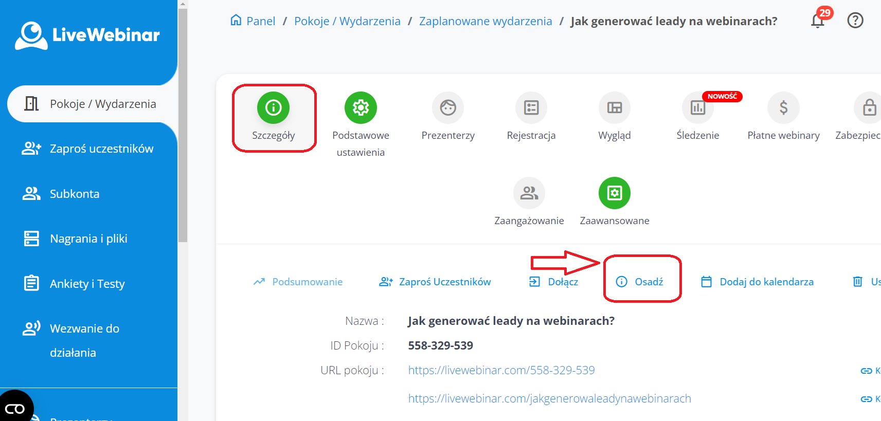 1. Zaloguj się do panelu LiveWebinar i wybierz wydarzenie, które chcesz osadzić lub utwórz nowe i przejdź do sekcji „Szczegóły” w menu głównym wydarzenia.