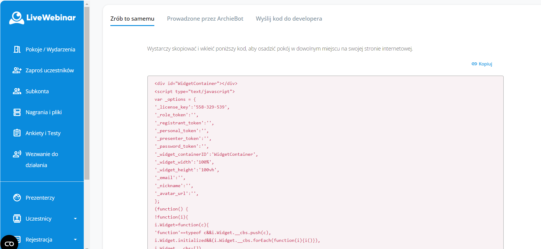 2. Jeśli chciałbyś osadzić pokój spotkania na swojej stronie internetowej przejdź do sekcji “Zrób to samemu” (Do it yourself) i skopiuj kod osadzający. Wklej go w dowolnym miejscu na swojej witrynie.