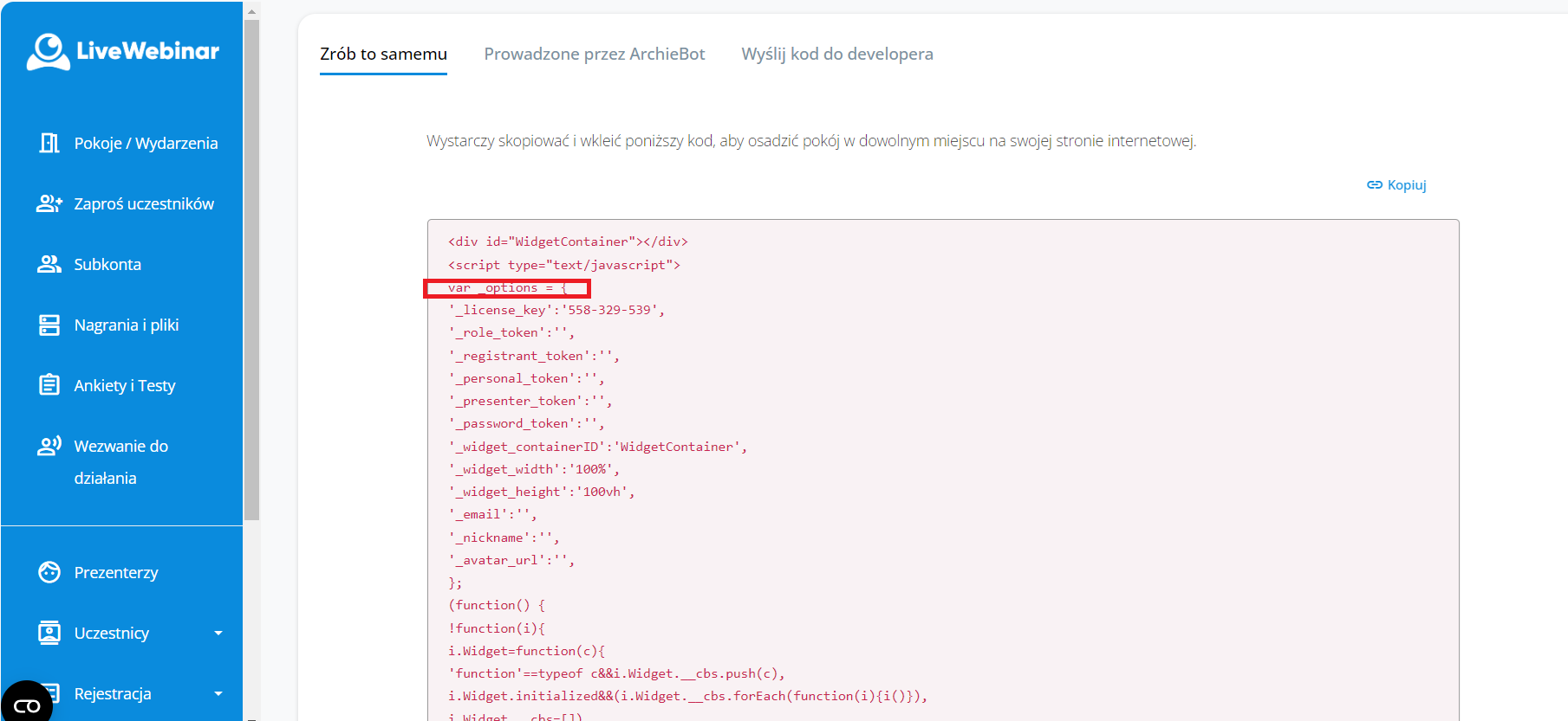 token” zaznaczony na ilustracji powyżej do swojego kodu osadzającego, osadzisz tym samym pokój z konkretną rolą (moderatora, prezentera, uczestnika lub hosta). To znaczy, że w zależności od tego jak określisz zaznaczony w poprzednim kroku tzw. _role_token, każdy uczestnik, który dołącza do pokoju spotkań wejdzie z określoną przez Ciebie rolą.
