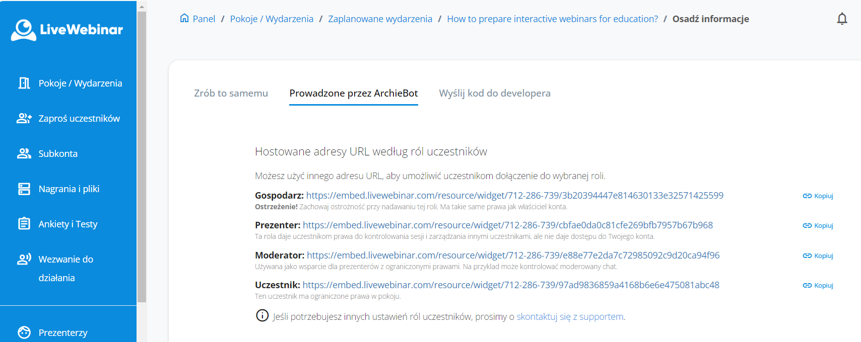 Jeśli chciałbyś przekazać odpowiednie linki dla moderatorów i prezenterów wydarzenia, przejdź do sekcji “Prowadzone przez Archiebot” (Hosted by Archiebot). Znajdziesz tam adresy URL opisane według ról uczestników. Możesz użyć tych linków, aby umożliwić uczestnikom dołączenie z wybraną rolą.