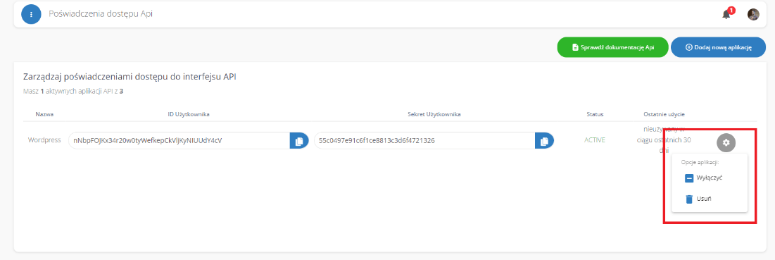 Często zadawane pytania -> Wtyczka Wordpress -> Jak usunąć poświadczenie dostępu do interfejsu API?