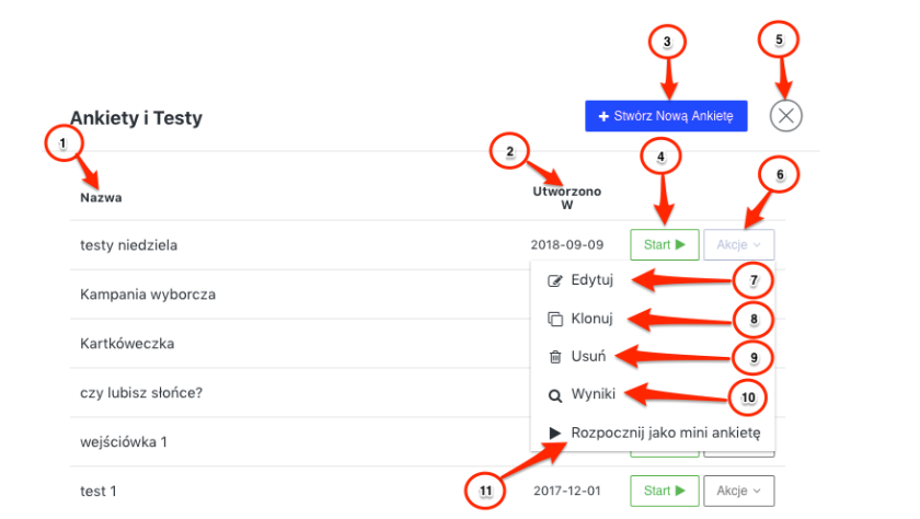 1. Nazwa - tutaj znajdziesz listę ankiet, które wcześniej utworzyłeś