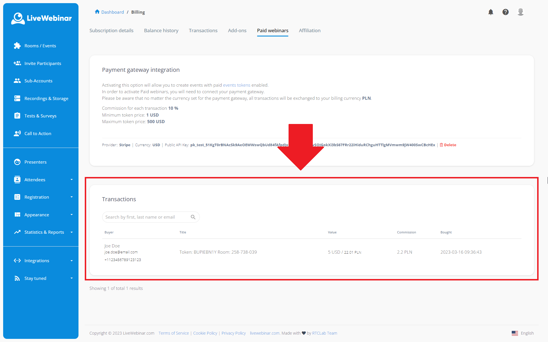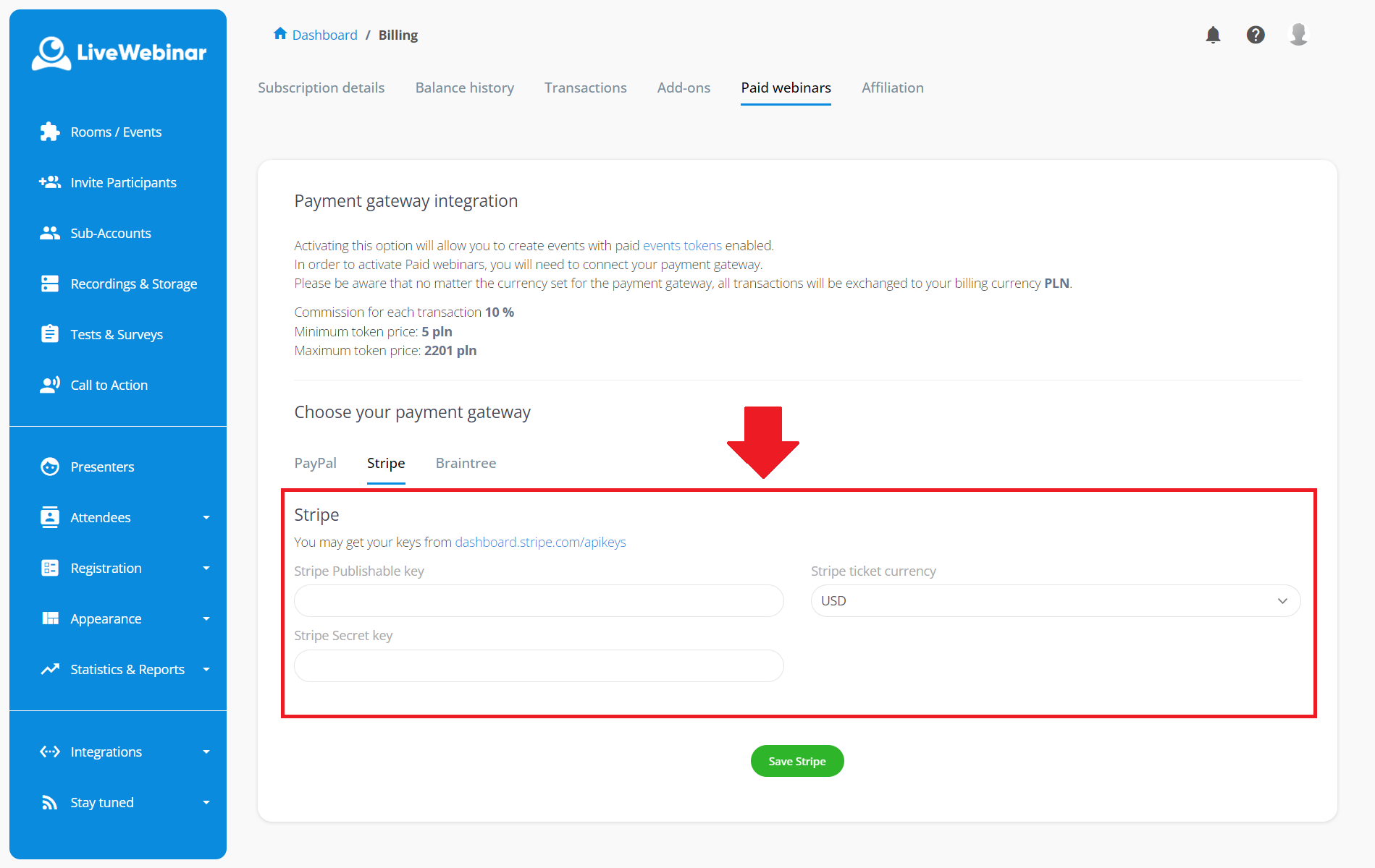 Bramka płatności Stripe dostępna jako metoda opłaty za płatne webinary oferuje możliwość włączenia Przelewy24, które pozwalają na dostęp do wszystkich banków i BLIKa, oraz samego BLIKa jako metody płatności.
